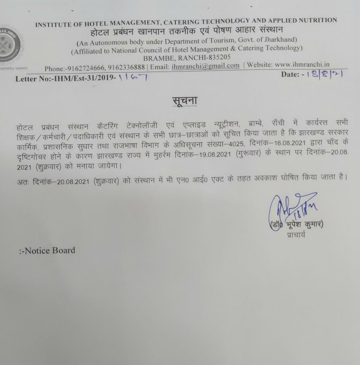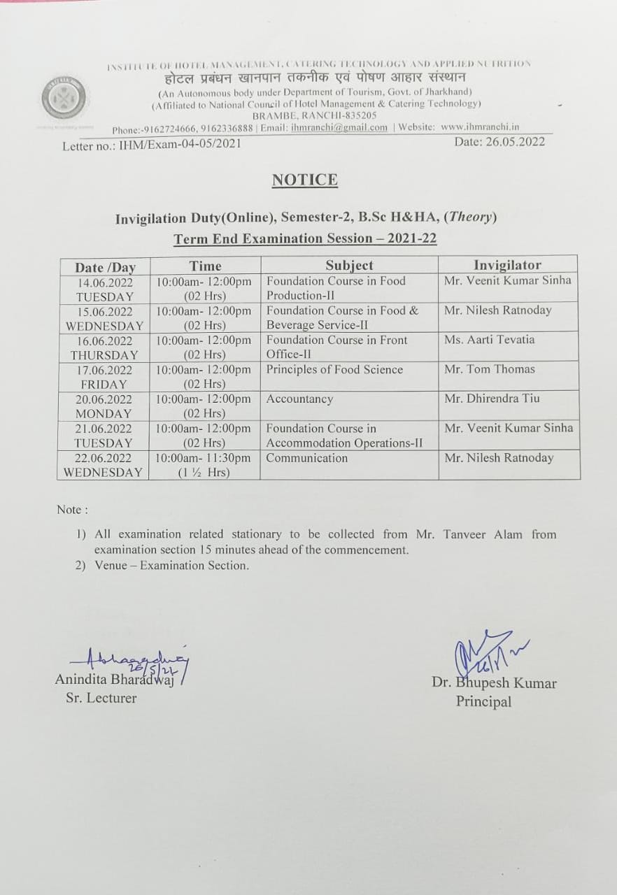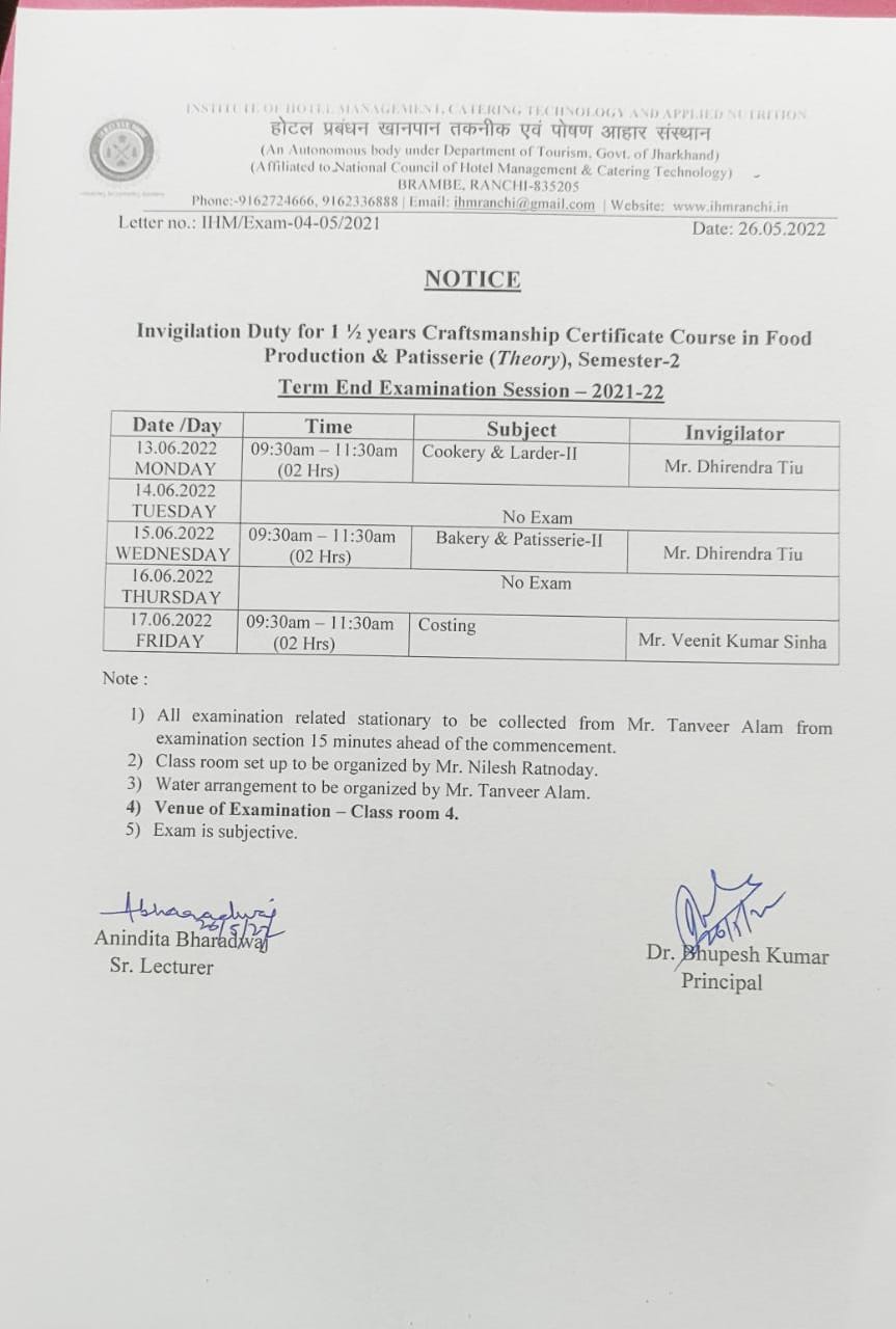Notice of Roaster duty at IHM Ranchi till 15.01.2022 |