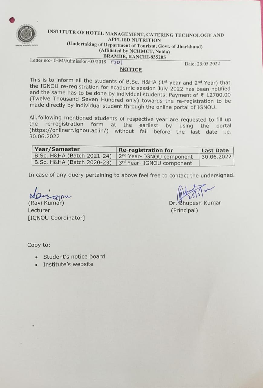 Regarding re-registration on IGNOU portalIGNOU re-registration for B. sc in H&HA students (1st and 2nd) year for Academic session July 2020-21. |