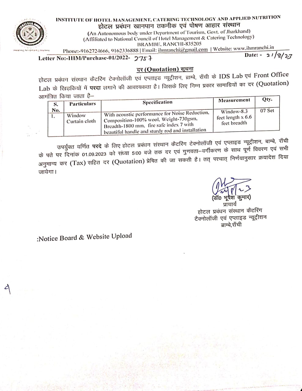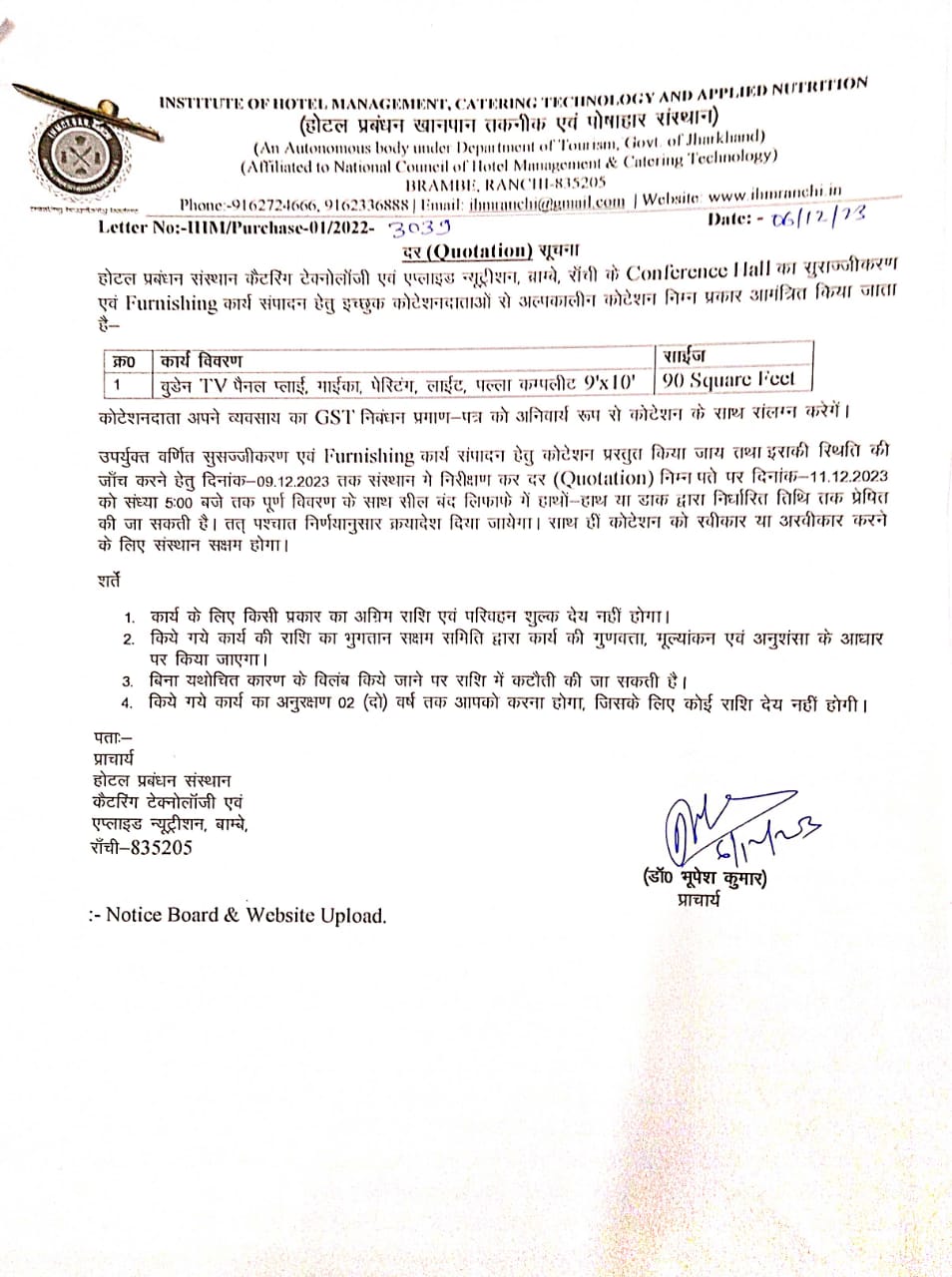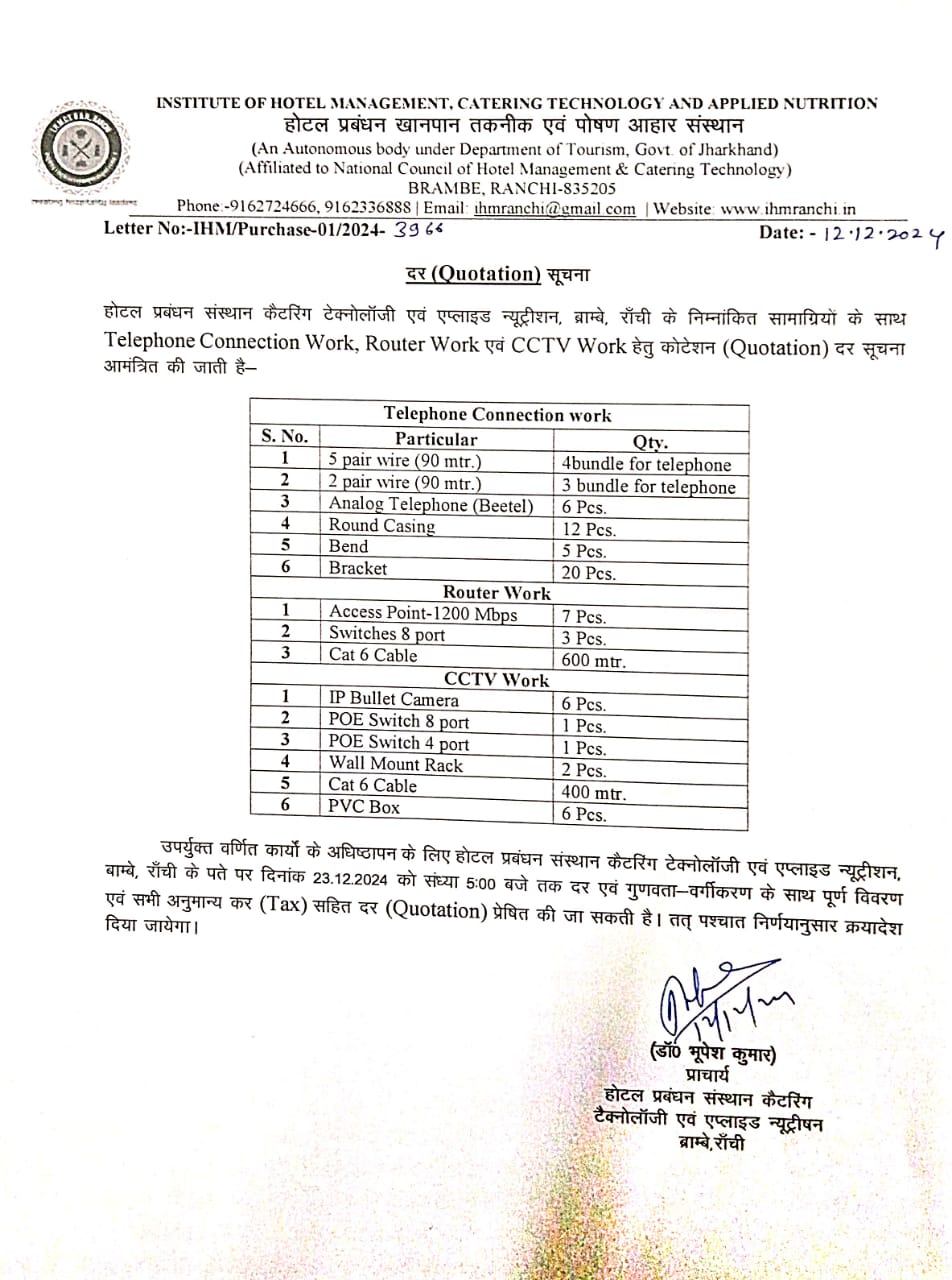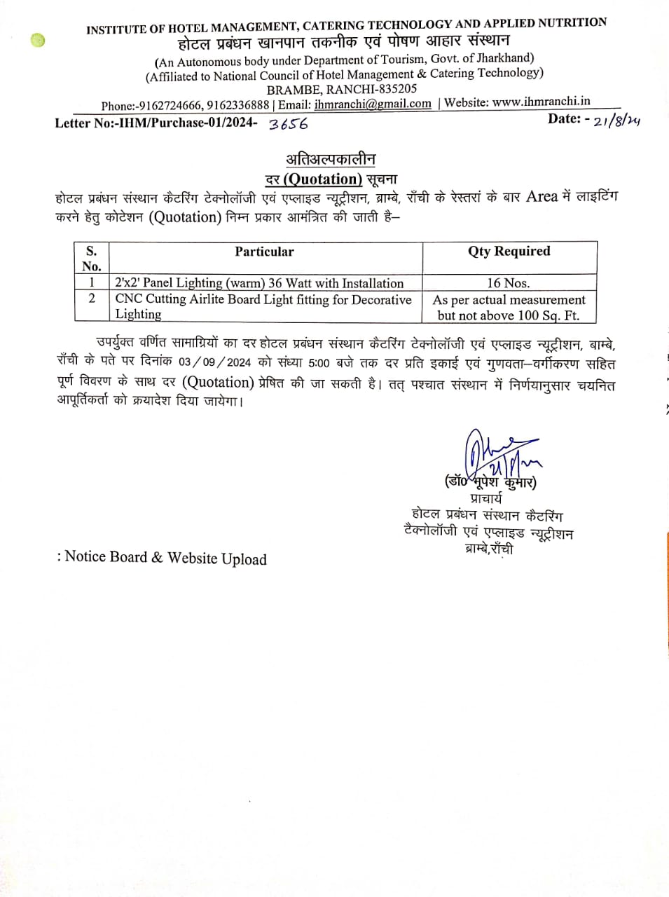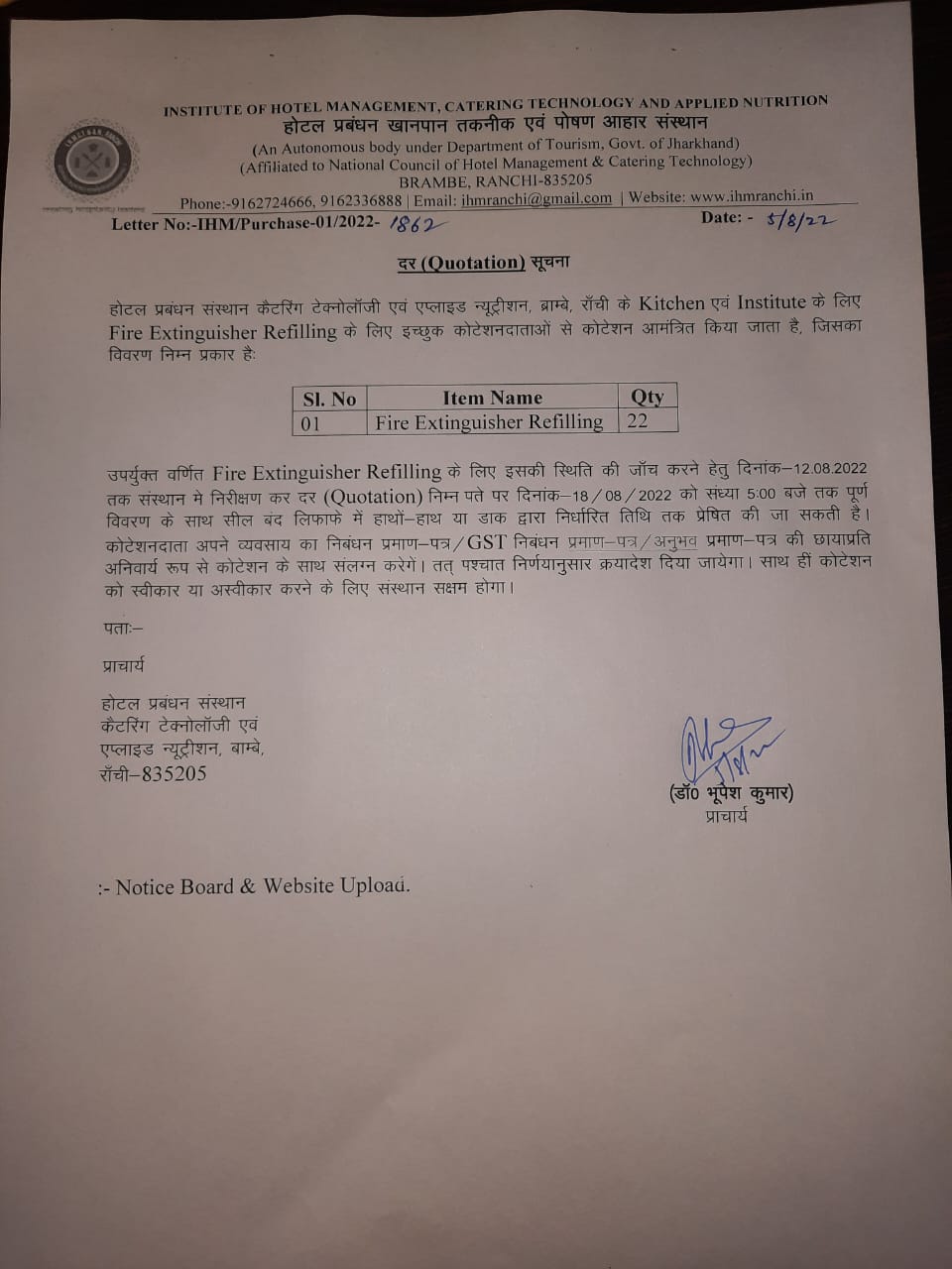 invitation of Quotation for Housekeeping items at IHM Ranchi |