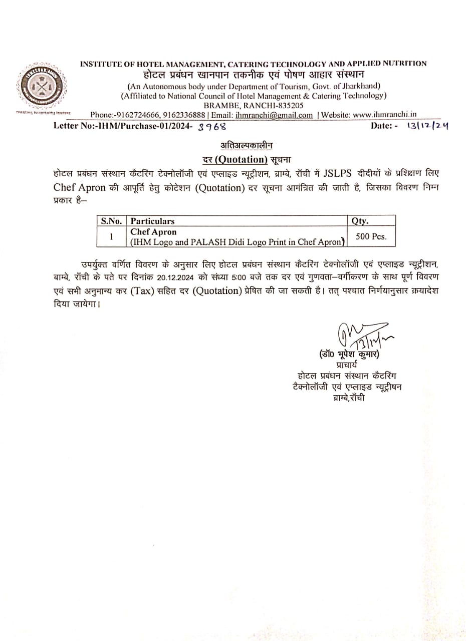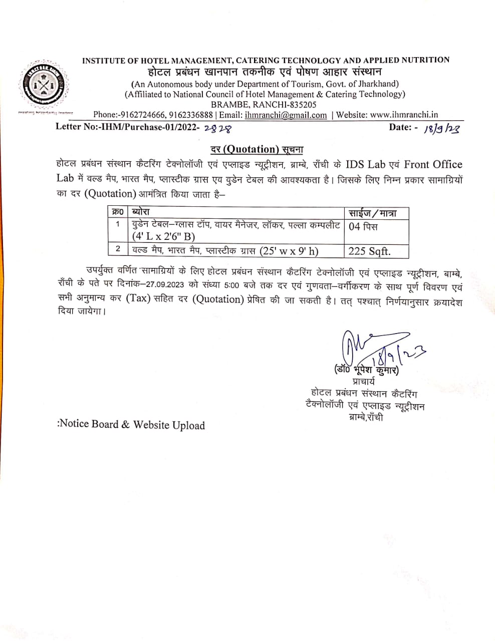 Quotation for supply of Hostel Mess & Practical for Institute following items at IHM. Brambe. Ranchi. Jharkhand |