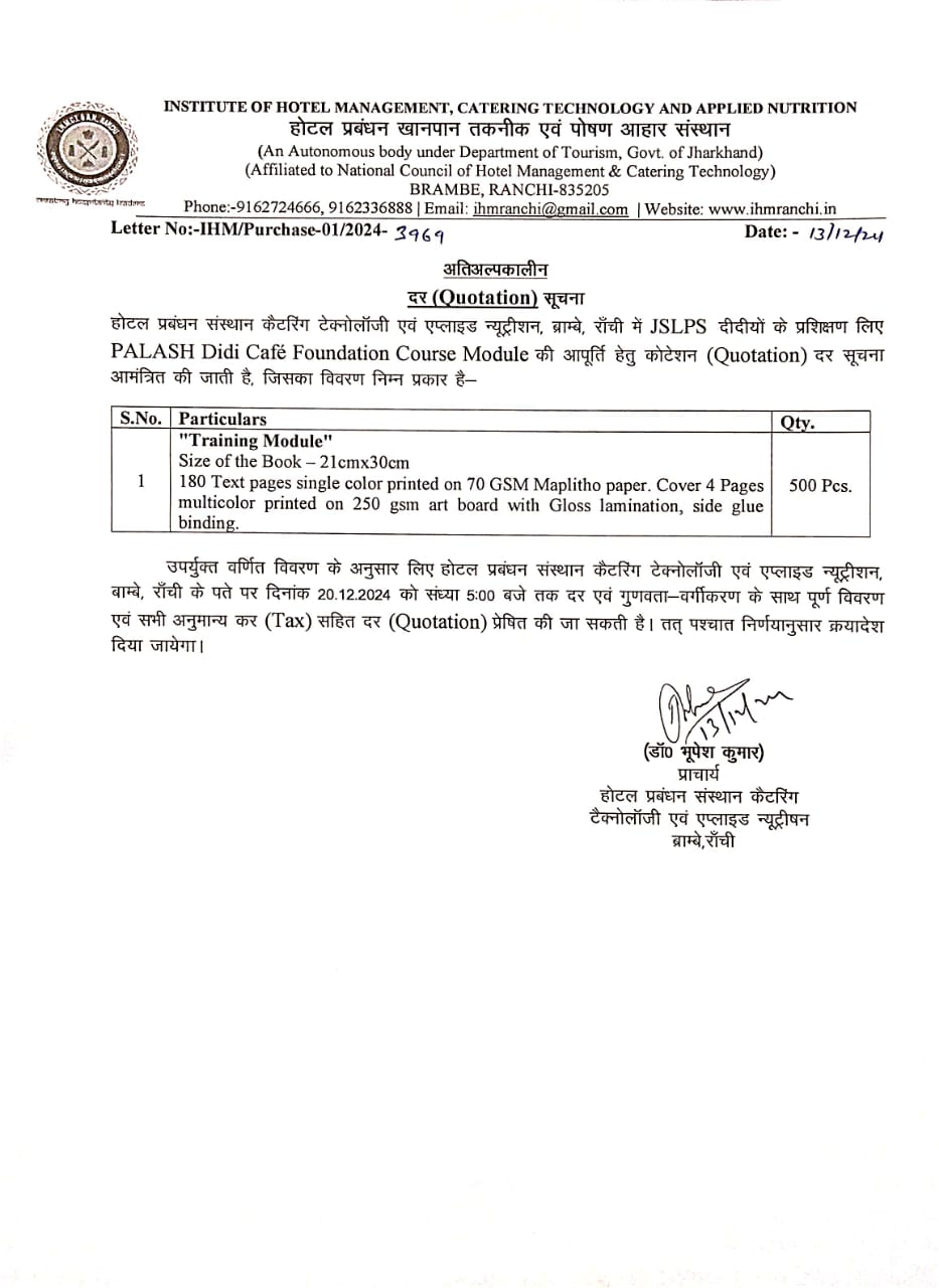 Quotation for supply of Stationery Items at IHM. Brambe. Ranchi. Jharkhand |