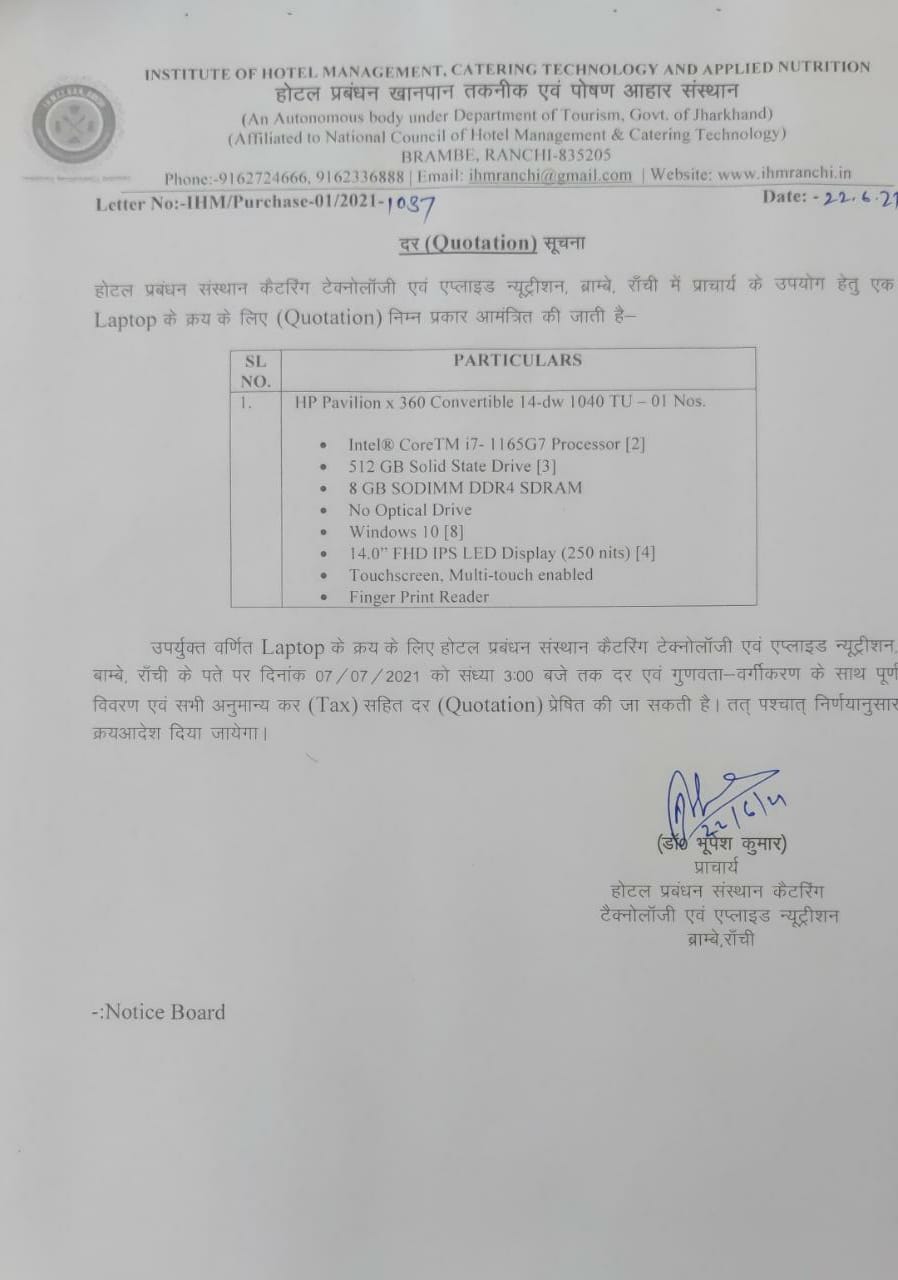 Invitation for Quotation of small equipment in Craft Kitchen, IHM Ranchi |
